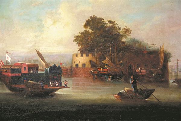 An oil painting of Haizhu Fort (top), featuring its name on the front of the structure (as shown in detail above), and The Dutch Folly (center) are two representative works of Qing Dynasty (1644-1911) trade paintings collected by Kuang Lin.[Photo provided to China Daily]