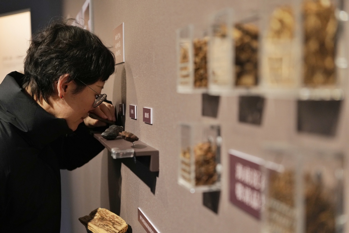 A visitor smells a piece of agarwood at the Shanghai History Museum on Jan 23, 2026 in Shanghai. [Photo by Gao Erqiang/chinadaily.com.cn]