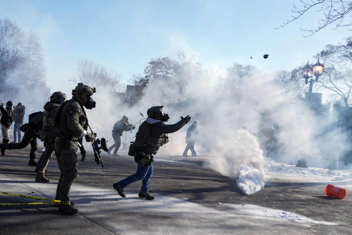 A federal agent throws a crowd-control weapon amid tear gas during scuffles at the scene of a shooting involving federal immigration agents in Minneapolis, Minnesota, US, January 24, 2026. [Photo/Agencies]