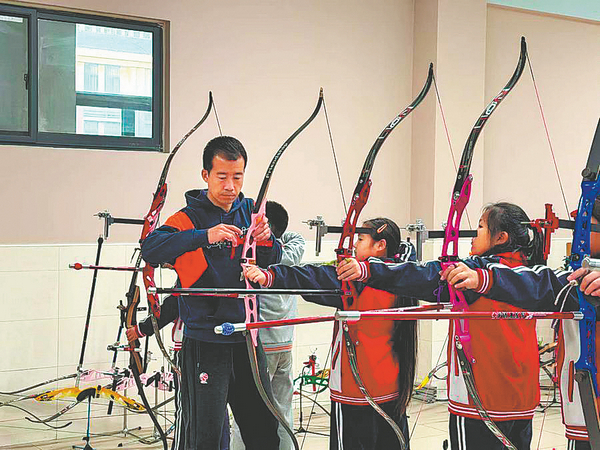 Li Weibin corrects a student's posture and gives instruction at Jinxiucheng Primary School in Jinan, capital city of East China's Shandong province, on Dec 15. There he works as head coach of the school's archery club. ZHANG LIYUAN/XINHUA