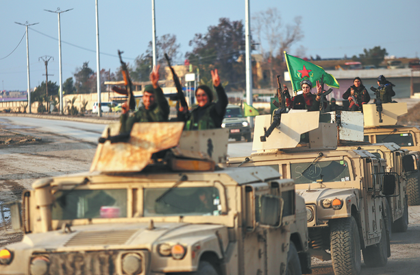 A convoy of the Syrian Democratic Forces heads toward the front line in Hasakah, northeastern Syria, on Saturday. BADERKHAN AHMAD/AP