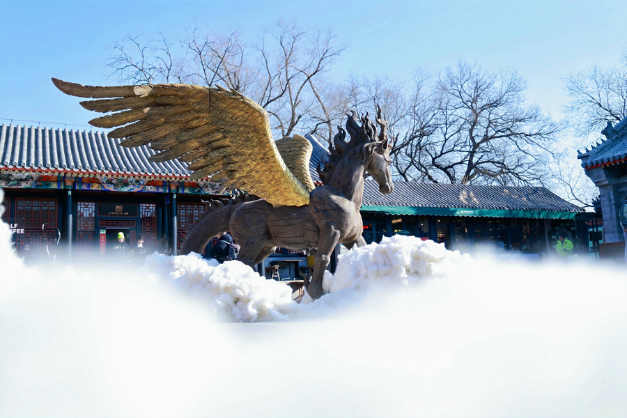 In Chinese mythology, the longma (dragon horse) is a legendary winged creature covered in dragon scales. Now, a massive 2.83-meter-tall woodcarving of this fabled beast has taken center stage at the 700-year-old Hong'en Temple in Beijing's Dongcheng district.