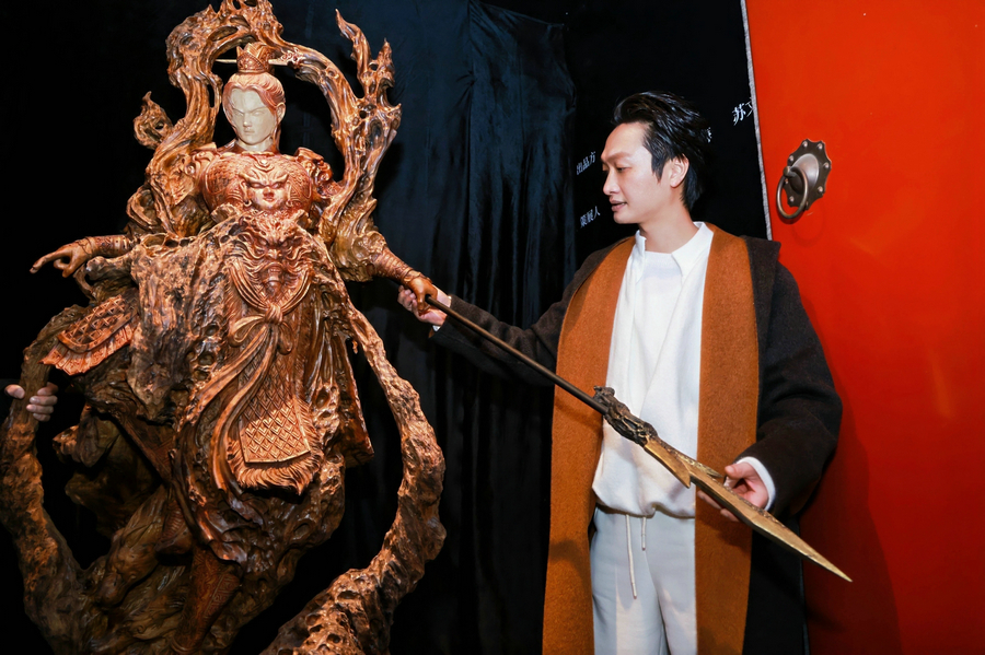 Woodcarving artist Huang Wangwang is seen with his work Yang Jian. [Photo provided to chinadaily.com.cn]