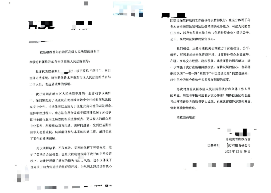A Pakistani bank has expressed its gratitude to a grassroots court in Urumqi, capital of the Xinjiang Uygur autonomous region, for resolving a labor dispute through mediation. In a letter to the Xinshi District People's Court, the bank commended the judges for their professionalism, patience, and judicial efficiency in handling the case.
