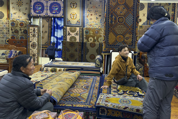 Shoppers browse Tibetan carpets in Lhasa, capital of the Xizang autonomous region. [Photo by Palden Nyima/chinadaily.com.cn]