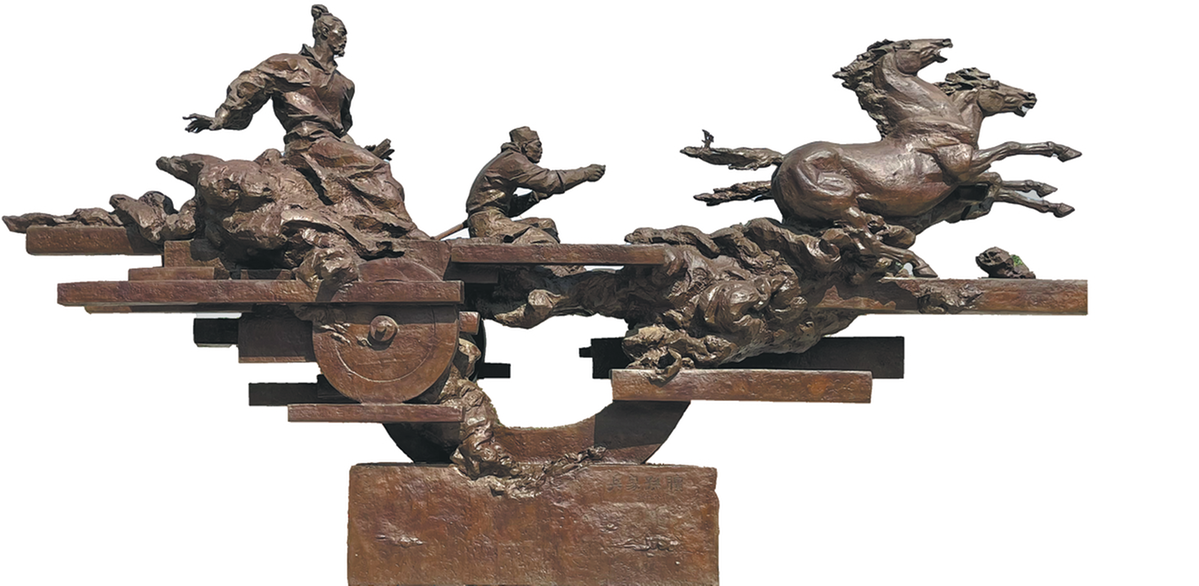 Among Sun's own horse-related works on display is The Strategist Sun Bin. As he puts it, the piece "applies Russian methods while adding Chinese romanticism". The sculpture depicts Warring States Period (475-221 BC) military strategist Sun Bin, who, despite his injuries, rides in a chariot through the clouds.
