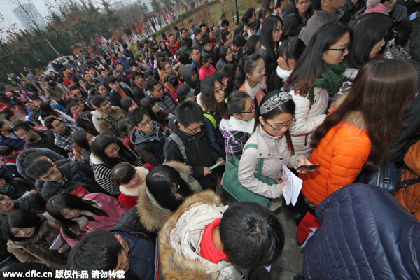 Graduates wait outside an exam site to attend the 2015 China National Civil Service Examination in Yantai city, Shandong province, Nov 30, 2014. [Photo/IC] |