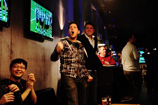 Fans cheer their team in a pub in Newcastle, the United Kingdom. LeTV Holdings Co Ltd has won the rights to broadcast the English Premier League for the coming three seasons in Hong Kong. [Photo provided to China Daily] |