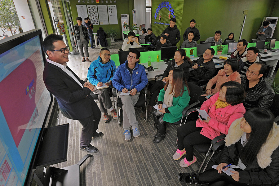 A man teaches marketing to online store owners in Qingyanliu village, Dec 30, 2015. [Photo/Xinhua]