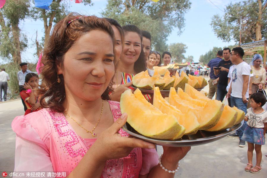 Local residents promote the Hami melon in a village in Aksu, Northwest China's Xinjiang Uygur autonomous region. [Photo/IC]