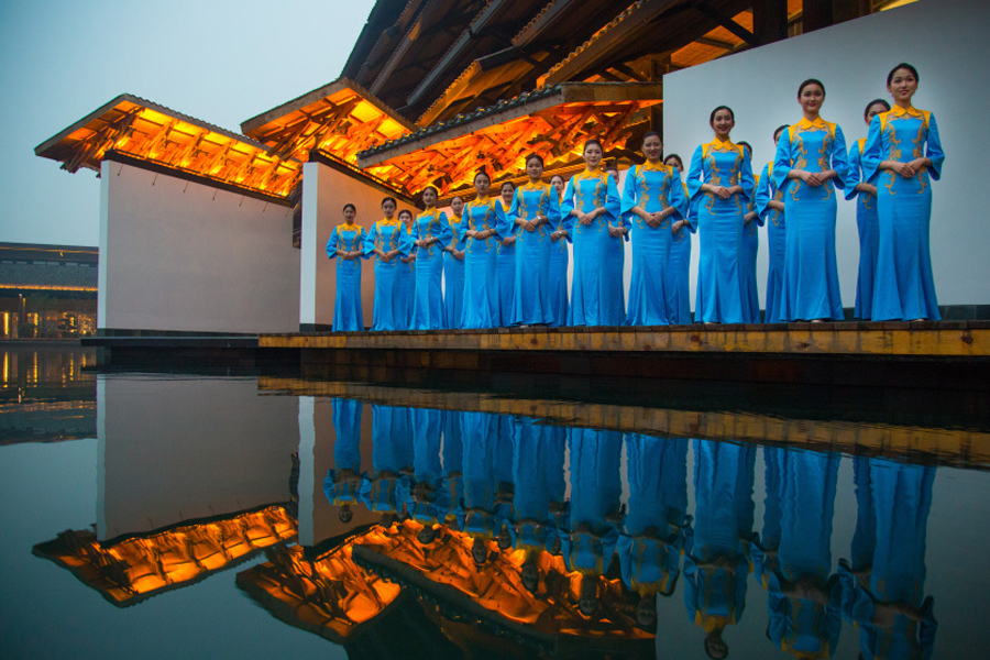 Volunteers dressed in traditional qipao with a phoenix motif stand at the Wuzhen Internet International Convention Center in Wuzhen, Zhejiang province, on Nov 14, 2016. [Photo/VCG]
