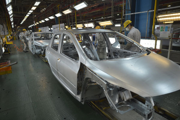 Workers on a car assembly line at Dongfeng Peugeot Citroen Automobile Co Ltd in Wuhan, Hubei. [Shepherd Zhou / for China Daily] |