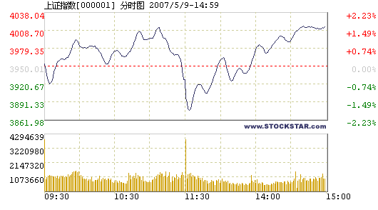 Shares close above 4,000 points; turnover hits new high(chinadaily.com.cn/Xinhua)Updated: 2007-05-09 17:18 China's shares prices kept bullish run on Wednesday as the benchmark Shanghai Composite Index stayed above the psychological 4,000-point mark at the close for the first time. The record high came as investors shrugged off central bank governor Zhou Xiaochuan's earlier warning on potential stock bubbles. The key Shanghai index, which covers both A- and B-shares, climbed 1.60 percent, or 63.07 points, to finish at all time high of 4,013.08 points despite profit taking brought down the index by 0.60 percent in the morning trade. The component index on the smaller Shenzhen Stock Exchange rose 1.02 percent, or 116.62 points, to 11,517.75 points. Combined turnover of the two bourses hit record high of 380.4 billion yuan (49.4 billion U.S. dollars). Heavy influx of investor cash helped to drive up the stock prices as more individual investors transferred their savings to the stock markets from the low yielding bank accounts. The Shanghai index has gained 50 percent this year after soaring 130 percent last year. In the first quarter to end March, 4.78 million stock accounts were opened in China and in April alone, another 4.5 million new accounts were set up. Blue chips led the rally. China Unicom, China's second-largest mobile phone operator, rose by the daily limit of ten percent to 6.35 yuan. Industrial and Commercial Bank of China added 5.47 percent to 5.78 yuan, and Bank of China gained 7.77 percent to 6.10 yuan. China Vanke, the country's biggest publicly traded property developer, climbed by the daily limit of ten percent to 21.88 yuan. Analysts said the pressure of profit taking has become heavier after the stock index broke 4,000-point mark. Wan Bing, an analyst with Guangfa Securities, warned investors of potential corrections and advised profit taking from shares that saw pretty high gains. The benchmark Composite Index on the Shanghai Stock Exchange closed at 4,013.09 points at 15:00 on Wednesday, up 1.60 percent from the previous close.
