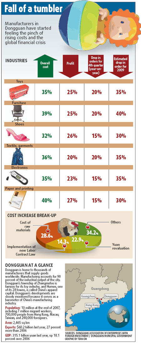 Toy makers in Dongguan have seen their orders drop by 20 percent for the last quarter of this year. And their manufacturing cost has risen more than 35 percent, according to the city's foreign investment enterprises' association. But despite everything, Yu is surprised by Smart Union's sudden closure because such big firms should be able to cope with such crisis through other means, including laying off some staff. Yu has cut the number of workers in his PC monitor factory from more than 2,400 last year to about 1,300. "Sudden 'escapes' are rarely seen in big firms' cases." If firms as big as Smart Union start jumping ship, it can pose a social problem, too, with thousands of migrant workers becoming jobless. Apart from paying the Smart Union's laid-off workers their arrear salaries, the Dongguan government has also set up a 1-billion-yuan fund to help local firms tackle problems. Moreover, the city is trying to devise measures to prevent firms from closing down suddenly, says Fang Shaoming, a director in the general office of Dongguan's bureau of foreign trade and economic cooperation. "The government is thinking of how better to support local firms especially legally, under which new measures would state clearly the responsibility of the firms." (For more biz stories, please visit Industries)