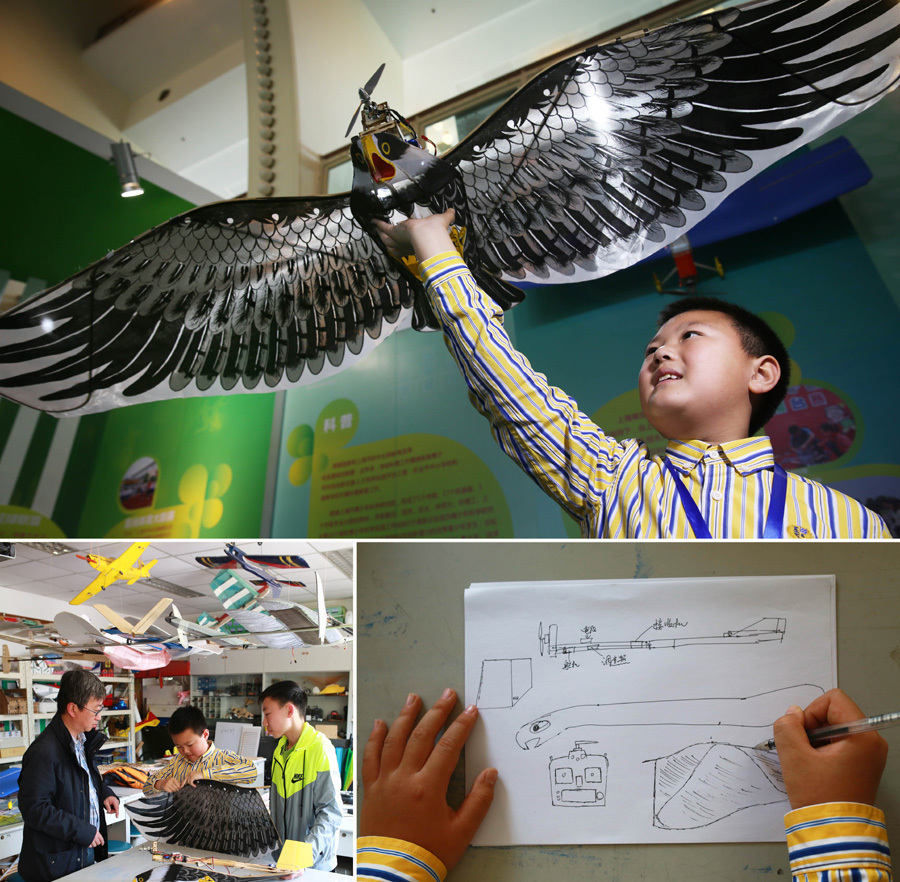Upper: Lu holds his eagle-like aircraft at an expo in Shanghai, April 12, 2015. Left: Lu adjusts his aircraft with his advisor Gu Yunyi in a classroom in Shanghai, April 12, 2015. Right: Lu draws the draft in a classroom in Shanghai, April 12, 2015. [Photo/Xinhua]