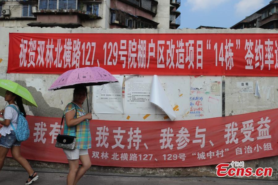 Banners hang in a shantytown in Chengdu, the capital of Southwest China's Sichuan Province, July 28, 2016. Over 200 families live in the shantytown built in early 1980s although they have no gas supply or drainage system while the neighboring areas have finished renovation to build skyscrapers. The shantytown will be renovated soon and the residents will move to new houses. (Photo/China News Service)