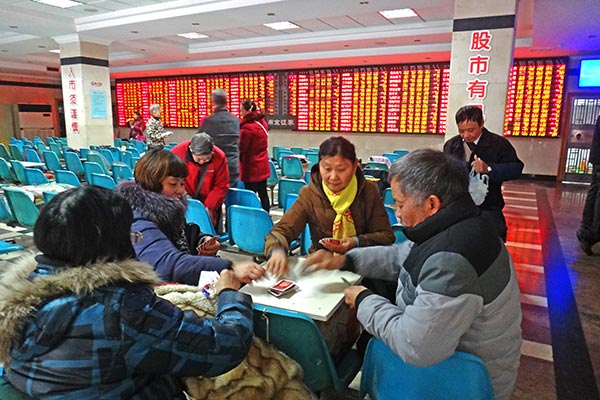 Investors play cards at a brokerage in Fuyang, Anhui province. The Chinese mainland market is likely to remain volatile in the first half as growth slows further and the yuan is expected to weaken. Provided to China Daily |