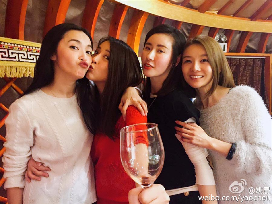 Actress Yao Chen posted photos of her reunion with her classmates on her Weibo account on Jan 31. Yao graduated from Beijing Film Academy in 2003. [Photo/Weibo]