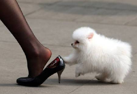 A puppy is seen playing with a woman wearing high-heel shoes on the street in southwest China’s Chongqing municipality, March 24, 2009.[Photo/CFP]