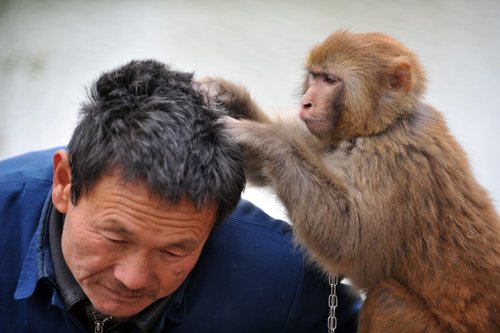 A small monkey pulls out grey hairs for its owner at Baohe park in Hefei, capital of eastern China’s Anhui province on December 9, 2009.[Photo/CFP]