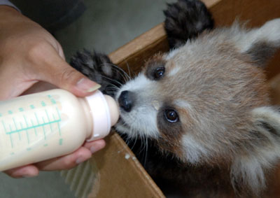 (newsphoto) Updated: 2006-10-11 20:02  A lesser panda cub resting in a hardboard box is fed with