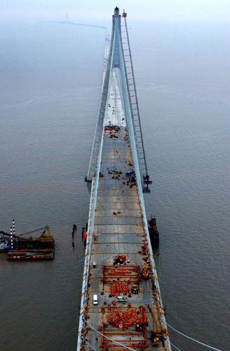 Built to withstand typhoons that hit the eastern Chinese seabord near Shanghai, as well as shifting soil conditions, the concrete-and-steel bridge took three years to complete and was one of China's most challenging construction projects. Firecrackers and traditional dancers greeted over a thousand guests at a ceremony in the middle of the bridge as engineers finished work on the final construction block. With three lanes in each direction and a rest and refuelling area at its middle, the bridge links Cixi City in Zhejiang province with Jiaxing City to the north, shortening the journey between Shanghai and the major port of Ningbo by 120 km (75 miles). Officials aim to open the bridge to traffic in June 2008 after support facilities such as toll gates and feeder roads are completed. The official Xinhua news agency said private firms provided about 29 percent of the bridge's cost, making it one of China's first big infrastructure projects to involve major private participation. Costs will be recouped through a toll system. ($1 = 7.62 yuan) |