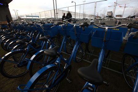 Free-to-ride bicycles are seen outside the Bella Center, venue of the 15th United Nations Climate Change Conference, in Copenhagen, Denmark, December 8, 2009. Copenhagen is the host city for the United Nations Climate Change Conference 2009, which lasts from December 7 until December 18. [Xinhua]