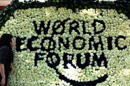 A resident smells some of the flowers decorating the coastal city of Dalian where the 2009 Summer Davos is set to be held tomorrow in northeast China's Liaoning province on September 9, 2009. [Xinhua]