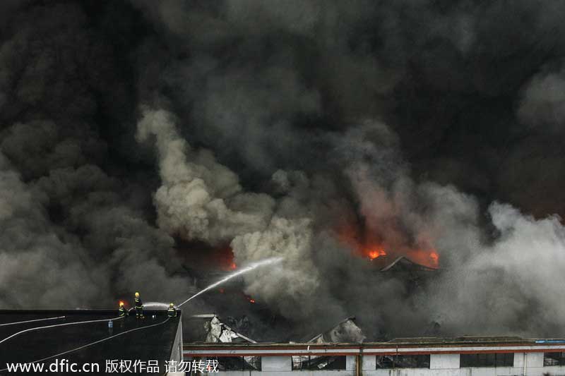 Firefighters attack flames emitting from a factory fire on Monday in Jiangshan County, Ningbo city of East China's Zhejiang province. [Photo/icpress.cn]