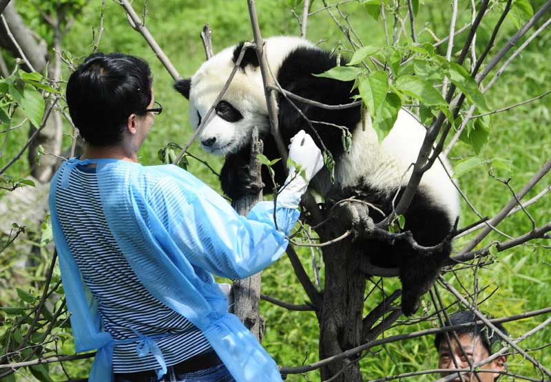 | A breeder tries to help a naughty cub stuck in a tree at the Zhouzhi wildlife research center, April 30. [Photo by Yuan Jingzhi/Asianewsphoto] |