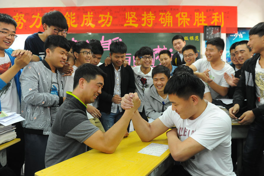 A senior high school student has an arm wrestling contest with his teacher during the break in Dingyuan High School, Chuzhou city, East China's Anhui province, May 20, 2016. [Photo/VCG]