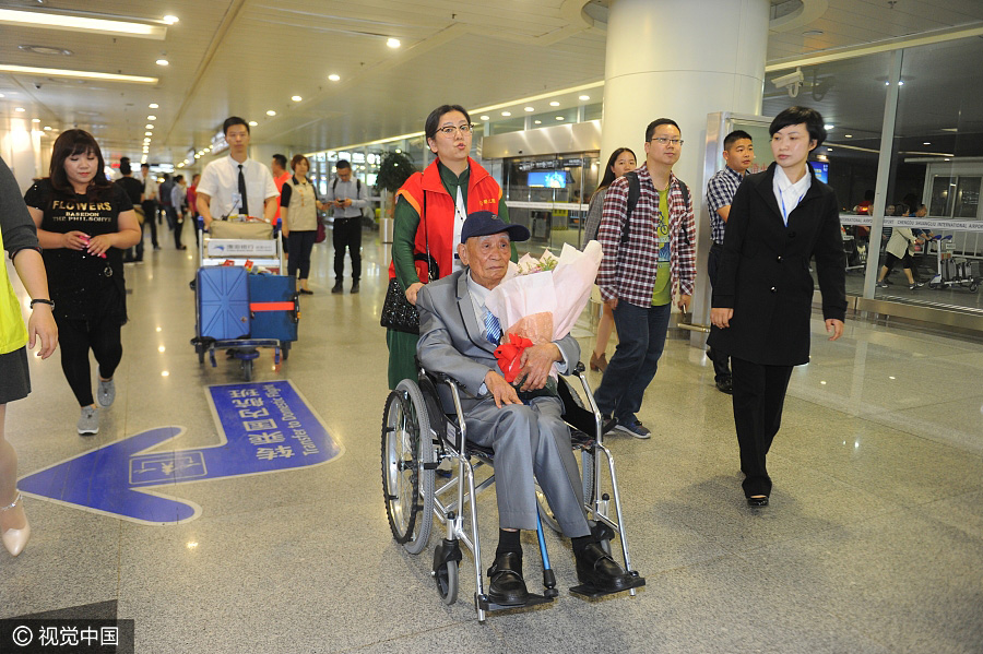 Hu Dingyuan, 97, is greeted after he arrives at the Chengdu Shuangliu International Airport in Chengdu city, the capital of Southwest China's Sichuan province, April 19, 2017. Cheng fought in the war against the aggression of Japanese forces and then in 1946 went to Taiwan as the Kuomintang forces retreated from the mainland to the island. He has never been back to his hometown in Luzhou City, Sichuan, in 77 years. In early March, his granddaughter sought help online to find relatives on the mainland. With the help of many people, Hu was able to return to Sichuan and will meet more than 80 family members, including three nephews. [Photo/VCG]