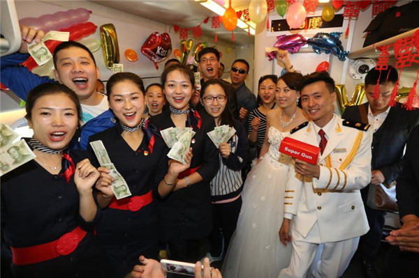 Train attendants cheer for the hongbao, red envelopes filled with cash they got during the wedding on Train No D6907. [Photo by Bo Yanhui/For China Daily]