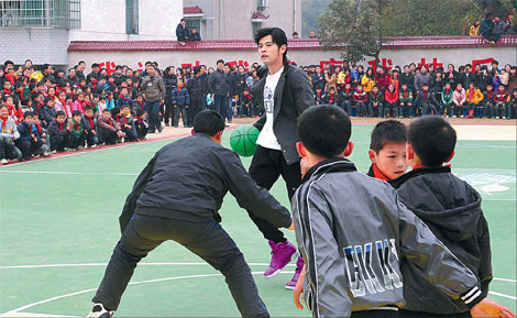 Pop singer Jay Chou plays with students at a Project Hope school in Zhifeng village in the city of Miluo, Hunan province, last month. Provided to China Daily |