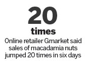 South Korea's largest online shopping retailer, Gmarket, said macadamia nut sales jumped 20 times during the six days to Sunday compared with the previous week.