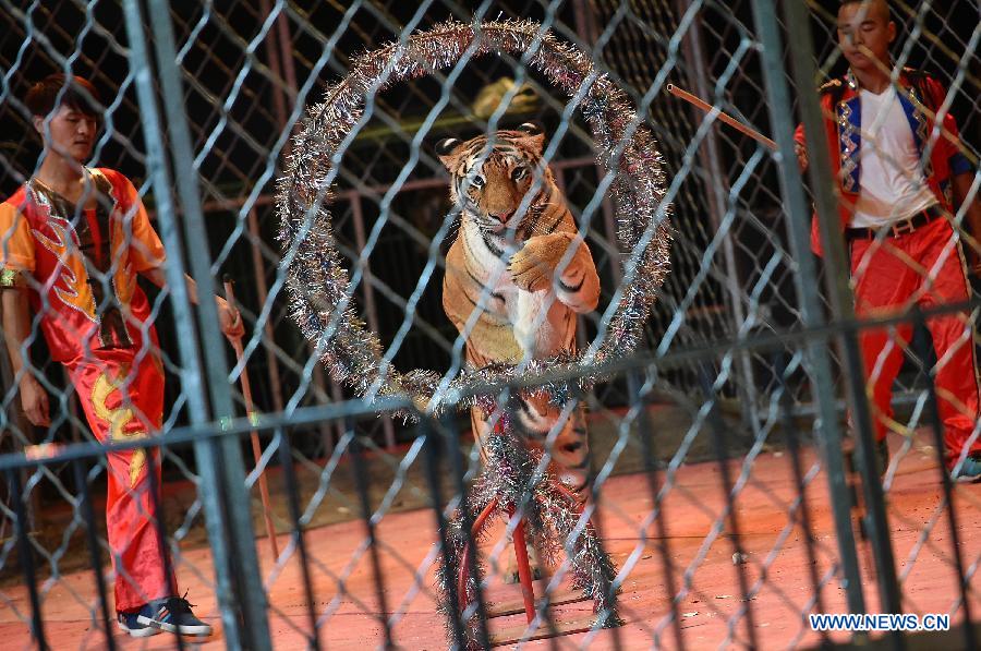 A tiger jumps through the hoop at a circus carnival in Yinchuan. [Photo/Xinhua]