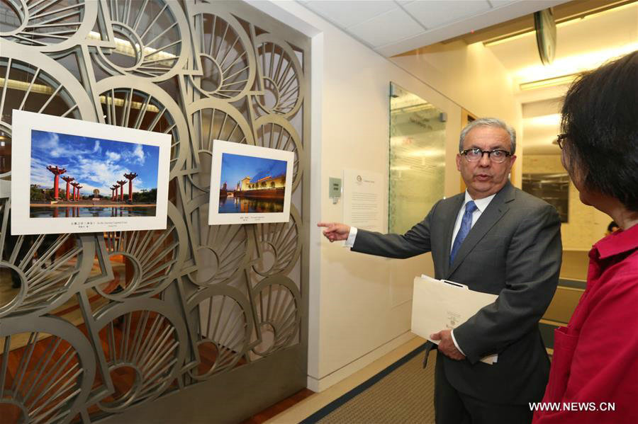 San Francisco Public Library City Librarian Luis Herrera (L) visits at the photo exhibition "Silk Road - A New Look" at the San Francisco Public Library, April 27, 2016. Jointly hosted by Chinese Consulate in San Francisco and San Francisco Public Library, the photo exhibition opened here on Wednesday and will last for 3 months.[Photo/Xinhua]
