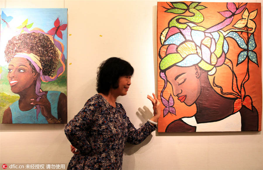 A visitor poses for a photo at the 2016 Latin America and Caribbean Art Exhibition at the China Millennium Monument in Beijing, May 5, 2016. [Photo/IC]