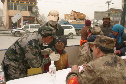 中国日报网消息:4月25日,四川省汶川县民兵在玉树开展灾后心理咨询活动,帮助灾区群众走出地震心理阴霾。