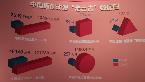 《成果展》对“十二五”时期的动漫产业发展进行了展望。展览中提出,到“十二五”期末,我国动漫产业产值将达1000亿元人民币,比“十一五”末至少翻一番,现代动漫产业体系将基本形成。我国动漫产品质量大幅提升,技术创新能力持续增强,精品力作不断涌现,动漫产业的品牌化、市场化、产业化程度显著提高,整体国际竞争实力大幅增强;动漫在青少年思想道德建设中发挥更大的作用,动漫在社会生活各领域得到更加广泛的普及应用。