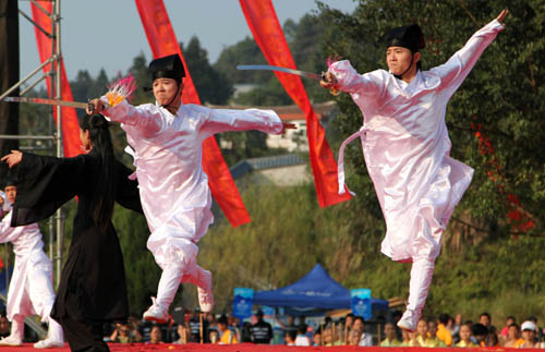 11月1日,在第四届南少林武术文化节开幕式的武术汇演上,两名武当派代表在表演武当剑法。