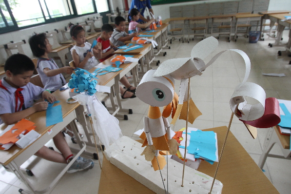 7月12日,在闵行区浦江镇的乡村学校少年宫,木偶的孩子们在制作木偶。