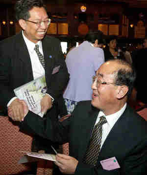 Vice-Minister of Health Gao Qiang (R) meets Director General of Taiwan Province's Center of Disease Control, Dr. Ih-Jeb after the opening of the WHO's first global conference on SARS in Kuala Lumpur on June 17, 2003.