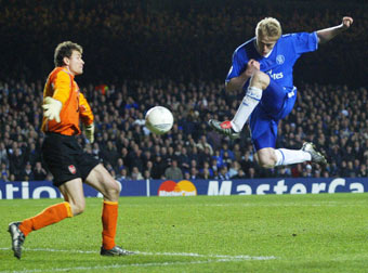 Jens Lehmann raced out of his goal to clear a long ball from Frank Lampard, but Eidur Gudjohnsen charged it down and coolly planted the ball in the empty net from a tight angle on the left edge of the box.