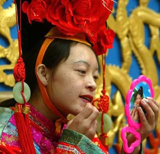 A Chinese visitor wearing traditional Qing Dynasty costume puts on makeup for a photograph at a park in Beijing May 2, 2004. More than 90 million tourists are expected to travel over during China's week-long national holiday, pouring 35 billion yuan ($4.23 billion) into tourism-related industries. [Reuters] |