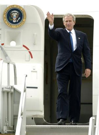 US President Bush waves from Air Force One upon his arrival at Oakland County International Airport, outside Detroit, Mich., Wednesday, July 7, 2004. Bush was in Michigan to meet with judicial nominees and attend a fund-raiser. [AP]