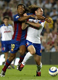FC Barcelona's Brazilian player Ronaldinho (L) fights for the ball against Zaragoza's Argentinian player Gabriel Milito (R).[Reuters]