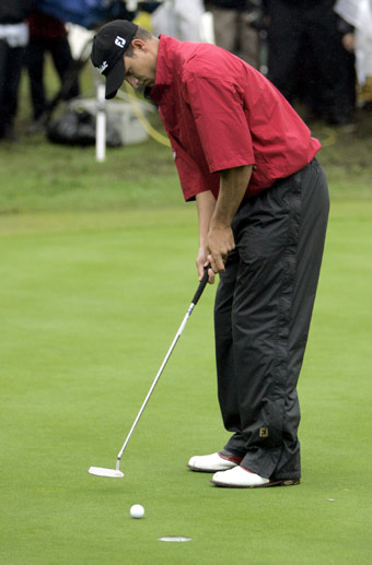 the 18th green during a one-hole playoff against Chad Campbell of the U.S.