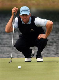 Retief Goosen, from South Africa, studies his putt on the 17th green Friday, March 4, 2005 during the second round at the Ford Championship at Doral in Doral, Fla. [AP]