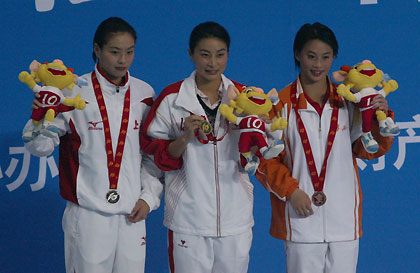 (Above) Olympic champions Guo Jingjing(C), Wu Minxia(L) and Li ting wave after the event of three-meter sprintboard at the 10th National Games in Nanjing on September 30, 2005. Guo seized the gold as Wu the silver. (Below)They attend the press after the match. [newsphoto]